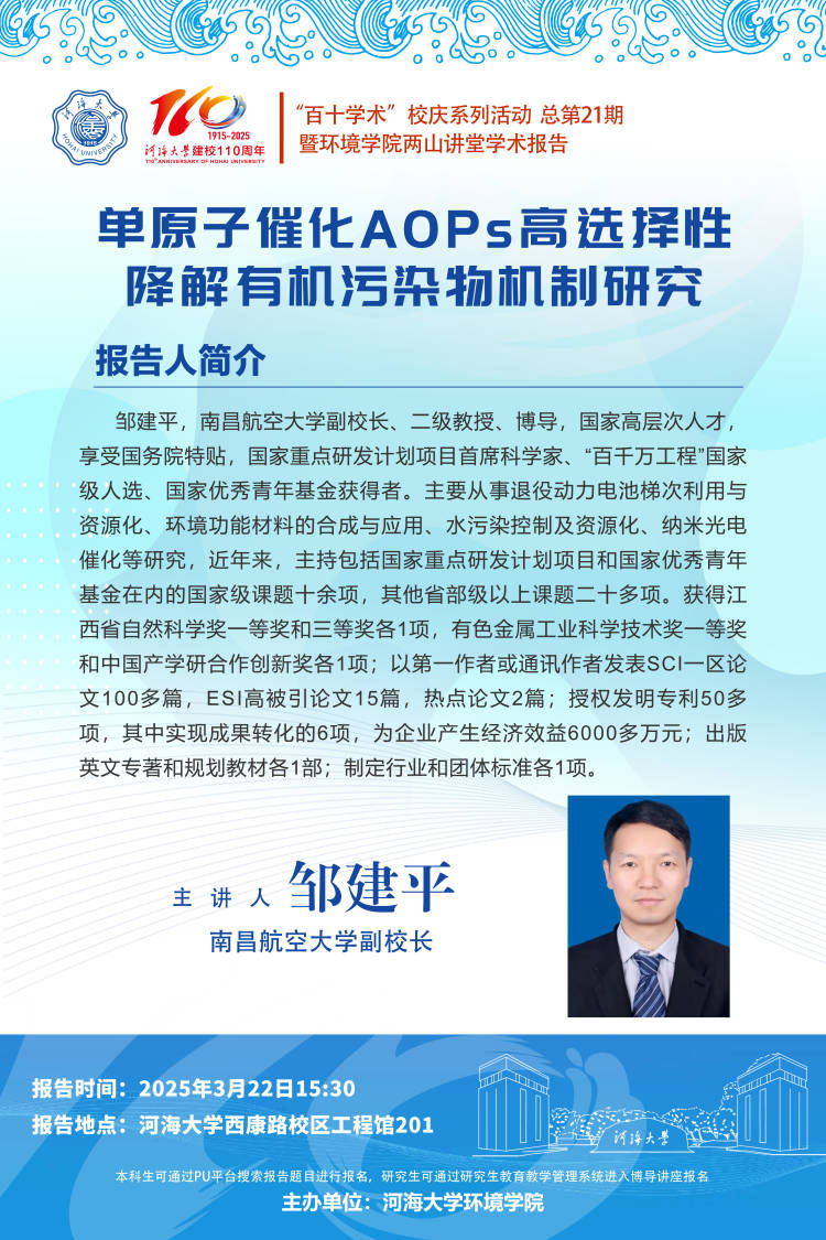 “百十学术”系列活动第21期——邹建平副校长:单原子催化AOPs高选择性讲解有机污染物机制研究