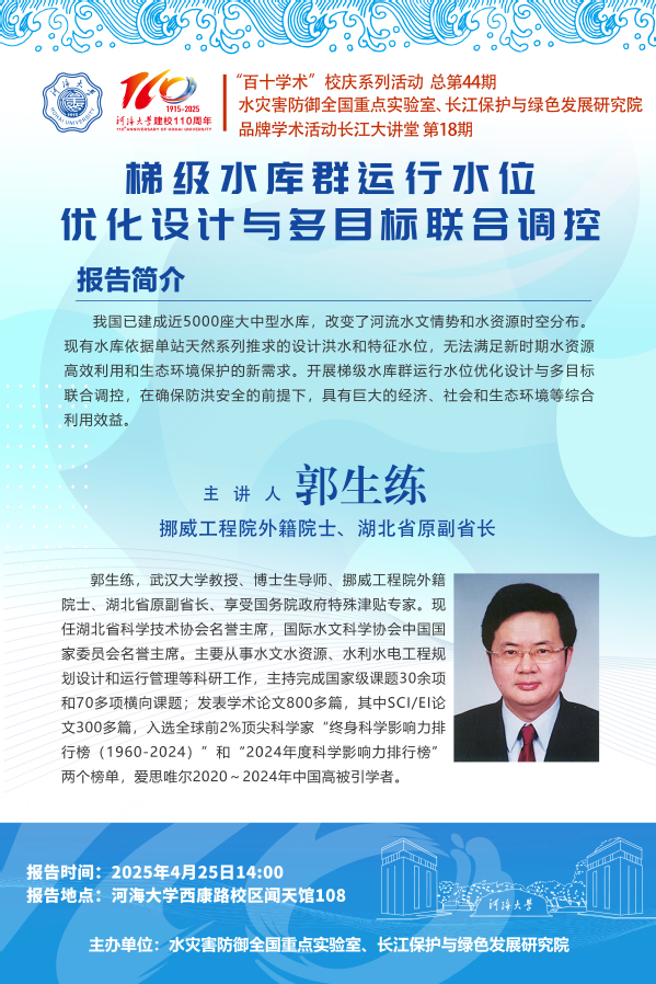 “百十学术”系列活动第44期——郭生练院士:梯级水库群运行水位优化设计与多目标联合调控