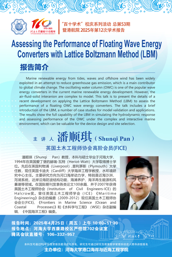 “百十学术”系列活动第53期——潘顺琪(Shunqi Pan)教授:Assessing the Performance of Floating Wave Energy Converters with Lattice Boltzmann Method (LBM)