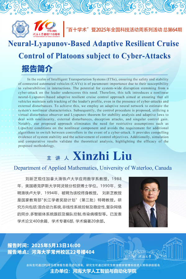 “百十学术”系列活动第64期——刘新芝教授:Neural-Lyapunov-Based Adaptive Resilient Cruise Control of Platoons subject to Cyber-Attacks