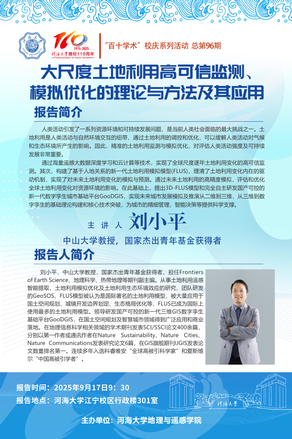 “百十学术”系列活动第96期——刘小平教授:大尺度土地利用高可信监测、模拟优化的理论与方法及其应用