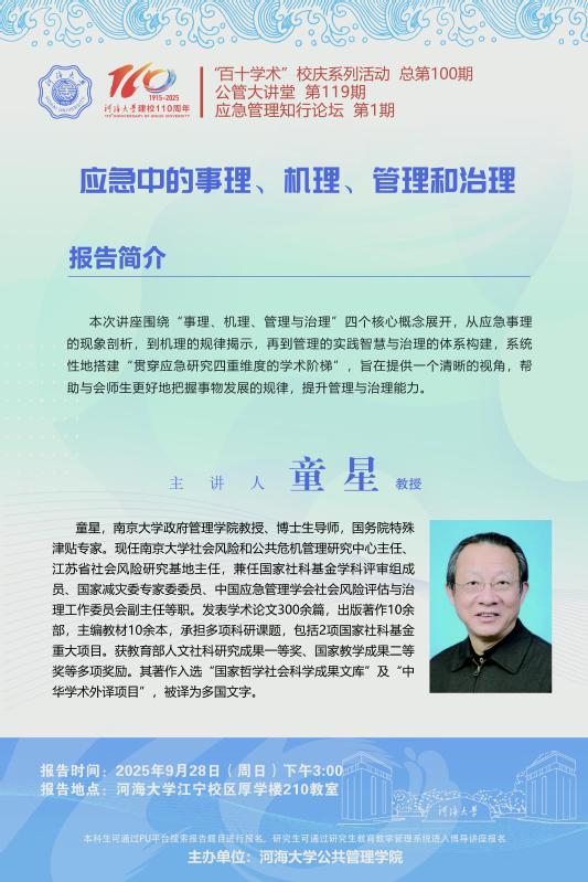 “百十学术”系列活动第100期——童星教授:应急中的事理、机理、管理和治理