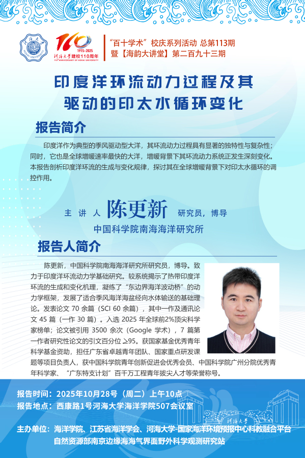 “百十学术”系列活动第113期——陈更新研究员:印度洋环流动力过程及其驱动的印太水循环变化