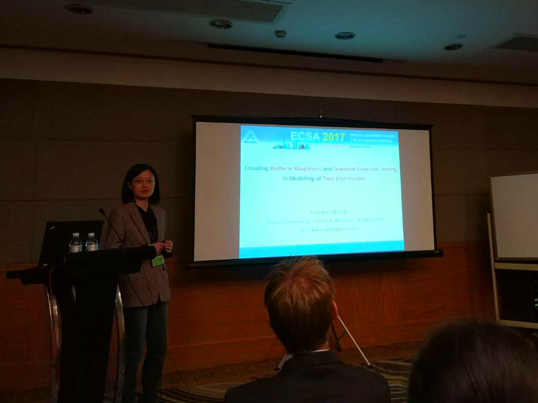 我院张蔚教授、王韫玮副研究员、季小梅副教授、张俞老师、徐龑文博士后等师生一行8人参加了此次会议。会上,张蔚教授做了题为“Subtidal Flow Division at Tidal River Bifurcations in the Yangtze River Delta”的报告,王韫玮副研究员做了题为“Coupling Bedform Roughness and Sediment Grain-Size Sorting in Modelling of Tidal Inlet Incision”的报告,徐龑文博士后做了题为“Analytical Solution for Salt Intrusion in Estuary with Multi-River-Source”的报告,季小梅副教授做了题为“Numerical Study of Seasonal Circulation and Variability over the Inner Shelf of the Northern South China Sea”的会议展板。其中,张蔚教授在会议上介绍的潮波运动对汊口分流理论的创新研究成果已于近期在河口海岸权威期刊《Estuarine, Coastal and Shelf Science》(196:301-314)上发表。通过此次会议,与会师生就河口海岸相关科学问题中的研究难点、热点与国内外专家、同行进行了探讨,为今后更深层次的交流与合作创造了机会。