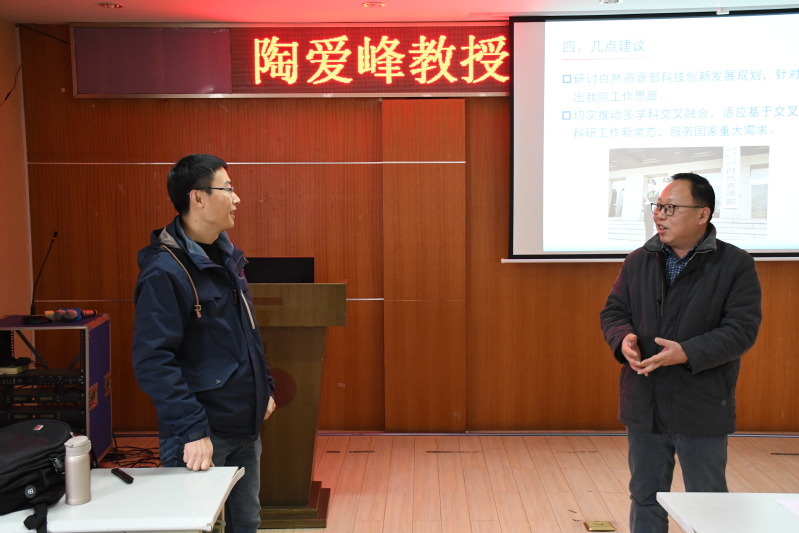 陶爱峰教授对挂职单位做简要介绍,并从自然资源部的职责定位、科技创新发展需求和个人成长心得体会等方面进行了汇报。