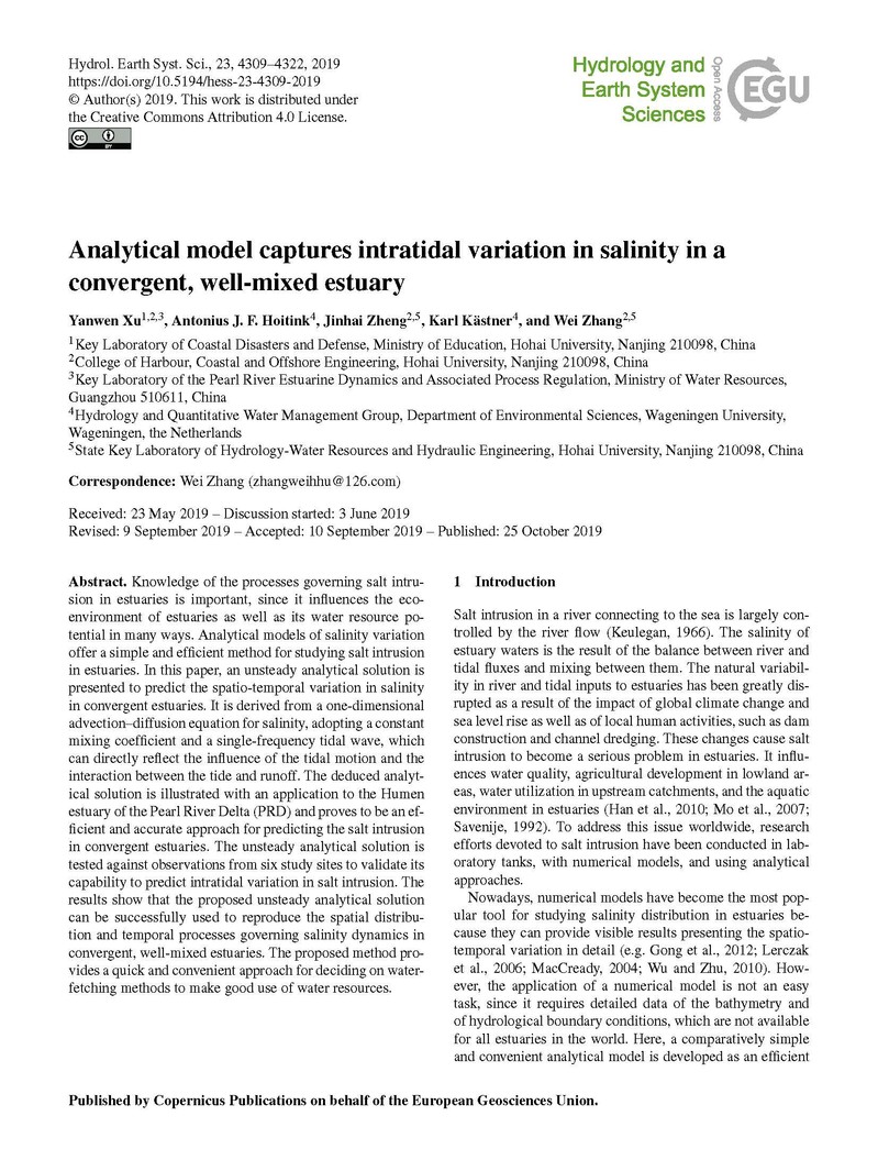 近日,徐龑文博士后和张蔚教授(通讯作者)在中科院一区国际学术期刊《Hydrology and Earth System Sciences》上发表高质量研究论文“Analytical model captures intratidal variation in salinity in a convergent, well-mixed estuary”。此研究是由我院张蔚教授研究团队领衔,与荷兰瓦赫宁根大学环境科学系Hydrology and Quantitative Water Management Group荷兰和德国学者组成的研究团队合作完成。