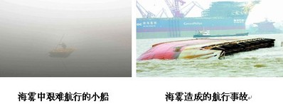 海雾是海上一种常见的天气现象。它能降低海上的能见度,使航行的船只迷失航路,造成搁浅、碰撞等重大事故。在狭窄航道、近岸区发生的海难中,由海雾引发的事故占了很大比重,所以说海雾是航海的克星。
