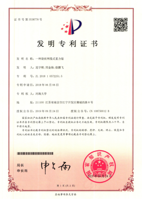 为了解决海洋浮式结构物锚泊的关键问题,我实验室郑金海教授和连宇顺副研究员提出了《一种袋状网缆式重力锚》的发明专利,已获得国家授权,专利号ZL201810572251.5。