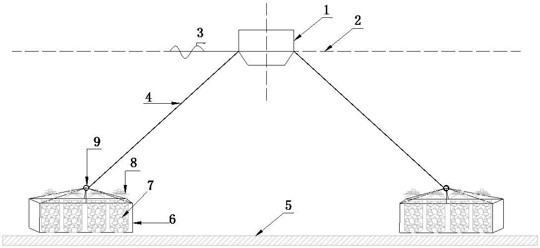 本发明在使用状态下的主视图,如下图所示。图中标记的含义如下:1、浮式波能装换装置,2、海平面,3、波浪环境,4、系泊缆绳,5、海床面,6、网缆式结构,7、橡胶皮袋,8、封装缆绳,9、不锈钢接头。