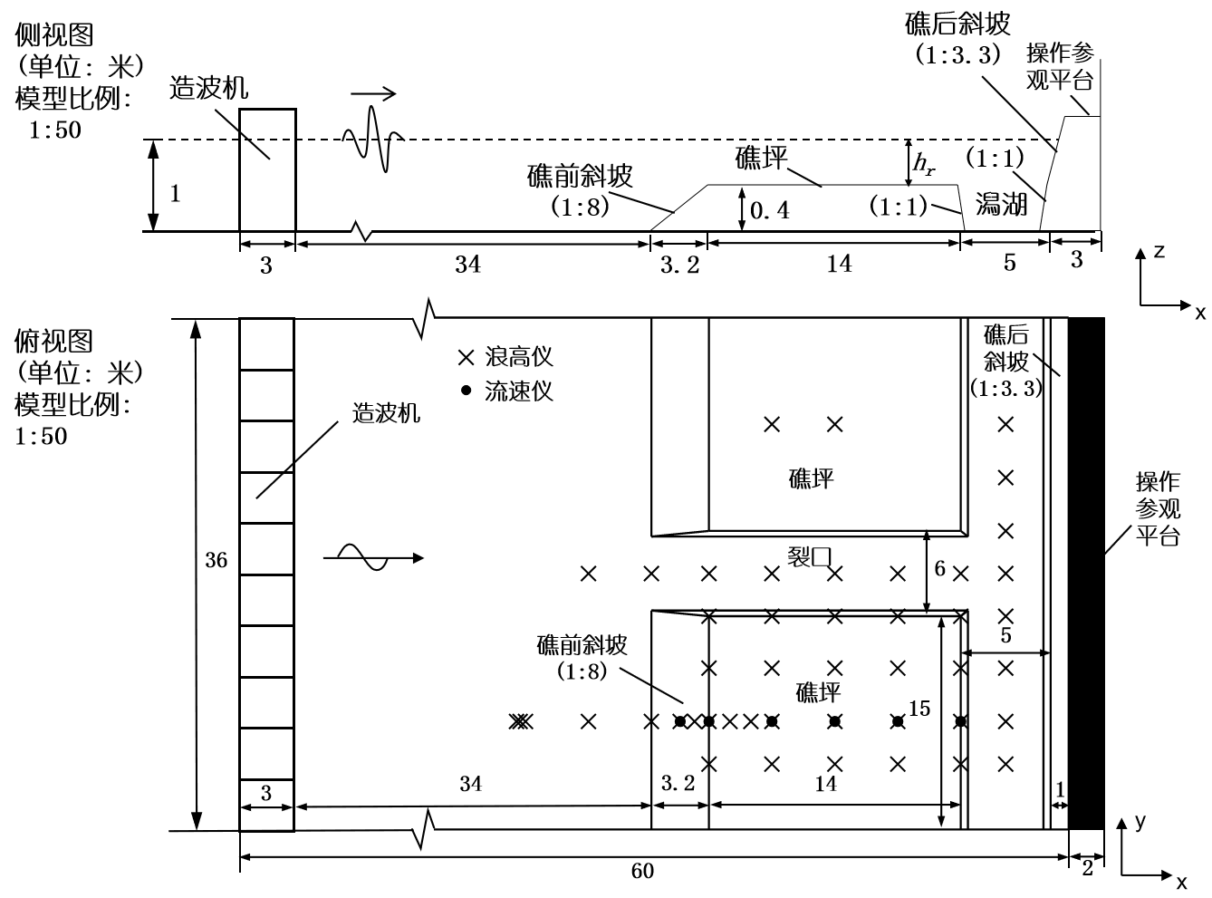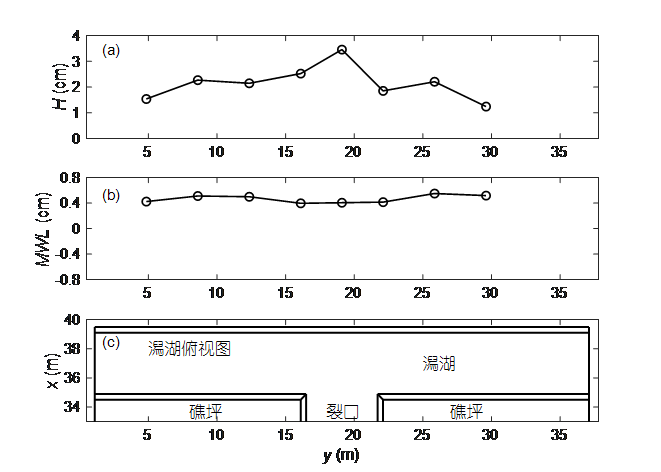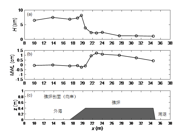 向岸剖面和潟湖沿岸剖面的礁坪波高和平均水位分布