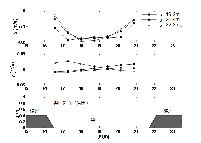 裂口向岸和沿岸剖面流速沿程变化