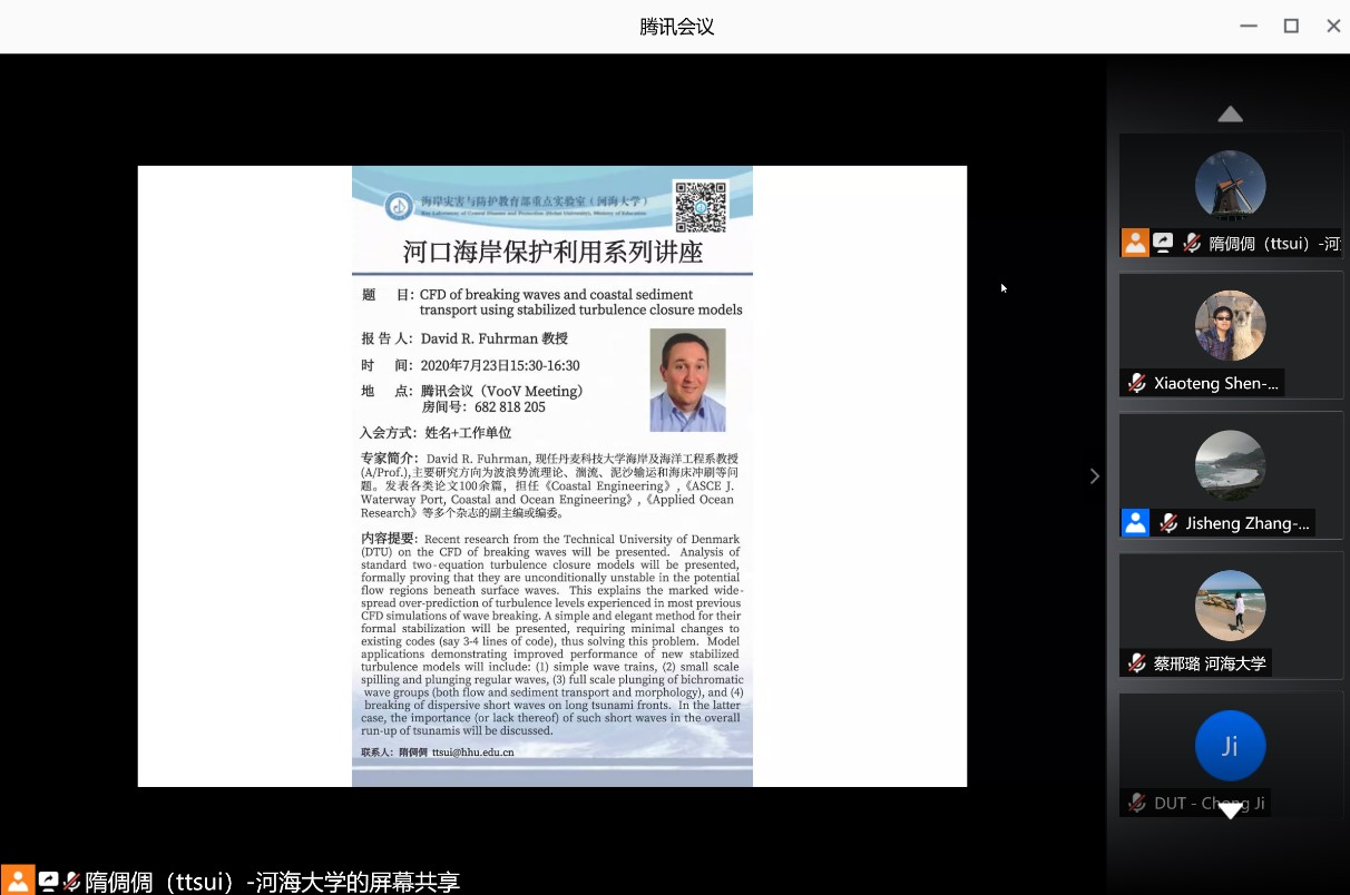 2020年7月23日,海岸灾害及防护教育部重点实验室(开云电竞网)组织的“河口海岸保护利用系列讲座”线上学术交流活动正式举行。丹麦科技大学(Technical University of Denmark)的David R. Fuhrman教授作为首场报告专家,作了题为“CFD of breaking waves and coastal sediment transport using stabilized turbulence closure models”的学术报告。本次报告由实验室主任、开云电竞网副校长郑金海教授邀请,由港口海岸与近海工程学院副院长张继生教授主持。