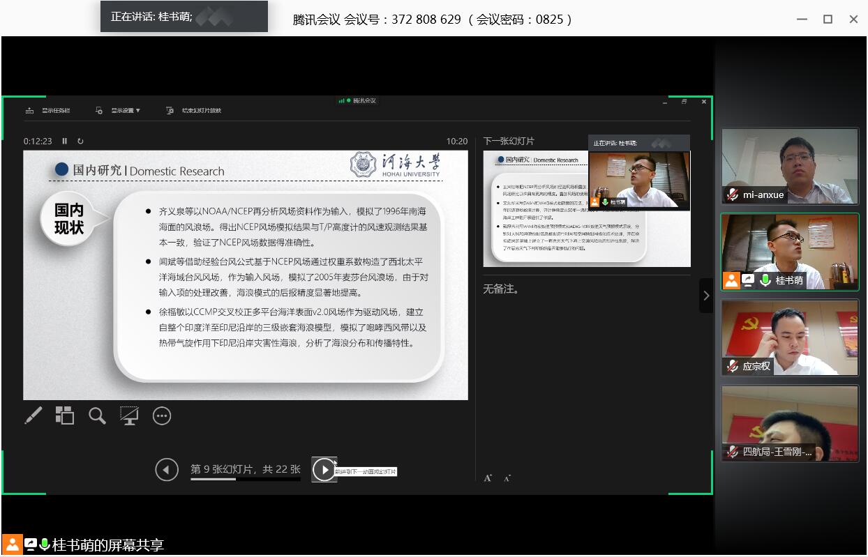 2020年8月25日上午10点,海岸灾害及防护教育部重点实验室薛米安教授、基地导师中交第四航务工程局有限公司科技管理部副总经理应宗权教授级高工、工艺所副所长王雪刚博士在线参加2019级全日制专业学位硕士研究生桂书萌的开题报告会。