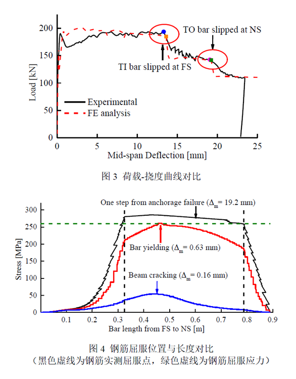 我实验室俞小彤博士后,联合查尔姆斯理工大学研究团队,一同开展自然锈蚀条件下RC梁粘结锚固性能研究,在近海工程领域权威期刊《Engineering Structures》(Q1,IF = 4.471)上发表论文。选取瑞典一座服役80年的RC桥梁的边梁进行3点弯曲试验,并采用非线性有限元分析(NLFEA)对试验梁的粘结锚固性能进行深入分析。为考虑屈服对粘结的损伤作用,创新性地赋予钢筋屈服段与未屈服段2种不同的粘结-滑移本构形式,准确地再现了试验梁弯曲特性。进一步对9根试验梁进行数值反演分析,对比试验与模拟结果,包括荷载-挠度曲线、裂缝开展模式与宽度、钢筋屈服位置与长度,获得梁内受拉钢筋与混凝土的粘结-滑移关系,并分析锈蚀程度、浇筑位置、表观损伤程度的影响。结果表明:1)钢筋屈服引起的粘结损伤、不对称屈服行为对准确描述RC梁弯曲行为至关重要;2)对于未屈服部位,粘结强度越高,相应的残余粘结强度也越高,但滑移平台长度减小;3)保护层混凝土剥落损伤会降低残余粘结强度,而开裂损伤几乎无影响。为节约计算时间,许多研究基于对称性假定,仅对半梁进行模拟分析,但本研究发现钢筋屈服过程具有不对称性,不应被忽略,否则会高估锚固长度,导致锚固破坏提前发生。