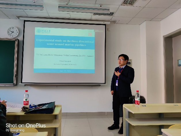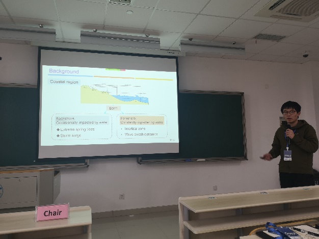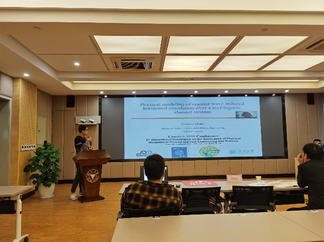 此外,连宇顺老师作了题为“Synthetic mooring ropes for renewable energy applications”《纤维系泊缆绳在海洋可再生能源工程应用》的报告,时健老师作了题为“Practice and exploration of Chinese living shorelines”的报告,沈骁腾老师作了题为“Floc size distributions of suspended cohesive sediments in estuarine and coastal waters”的报告,隋倜倜老师作了题为“Experimental study on the three dimensional scour around marine pipelines”的报告,曹祝宾同学作了题为“Observation of wave overwash on an artificial beach”的报告,甘敏同学作了题为“Novel approaches to predicting the water levels in mega-estuaries”的线上报告,陈树彬同学作了题为“Physical modeling of regular wave induced horizontal circulation over a reef-lagoon-channel system”的报告,张海明同学作了题为“Wave energy focusing due to three-dimensional bragg resonance with undulating bottom of V-shaped layout”的报告。陈树彬同学获得“会议优秀论文二等奖”。