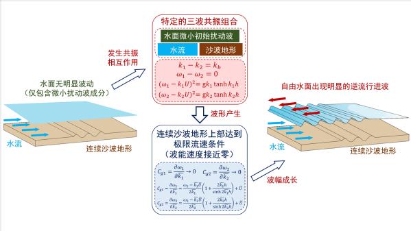 阐明连续沙波地形上逆流行进波产生的三波相互作用机制