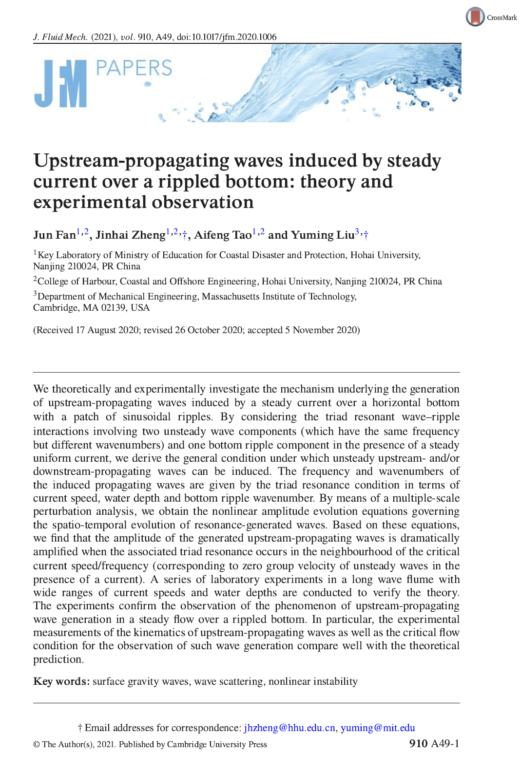 团队博士研究生范骏、指导教师郑金海教授、陶爱峰教授和“河海学者”讲座教授Liu Yuming博士合作完成的研究论文“Upstream-propagating waves induced by steady current over a rippled bottom: theory and experimental observation”发表在流体力学领域享有盛誉的国际顶尖期刊《Journal of Fluid Mechanics》上(http://dx.doi.org/10.1017/jfm.2020.1006)。研究工作得到国家杰出青年科学基金(51425901)的资助。