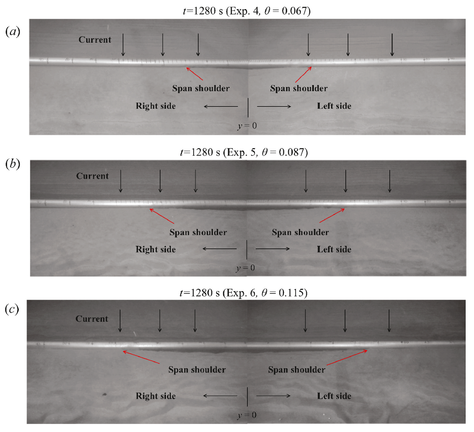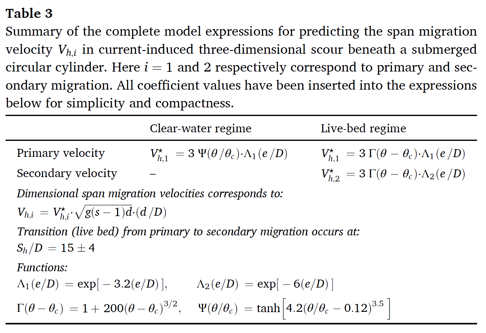 近日,实验室固定研究人员隋倜倜老师在海底管道冲刷领域取得进展,与丹麦科技大学海岸工程团队合作研究成果在一区期刊《Coastal Engineering》上正式发表,标题为“Span shoulder migration in three-dimensional current-induced scour around submarine pipelines”。基于物模模型试验,研究了水流作用下海底管道下方三维冲刷悬跨横向拓展速度。从海床冲刷的基础理论出发,基于量纲准则,提出了考虑清水和动床冲刷两种条件下的悬跨拓展速度预测模型。模型预测结果可在清水-动床冲刷临界条件处实现光滑过渡(图3),因而统一了自然界两种冲刷条件下的管道冲刷理论。模型考虑了流速、管道直径、泥沙粒径、管道埋深等管道冲刷的主要影响因素,与物理模型91组实测数据对比证实,本公式可成功应用于预测管道三维悬跨拓展的工程实践。