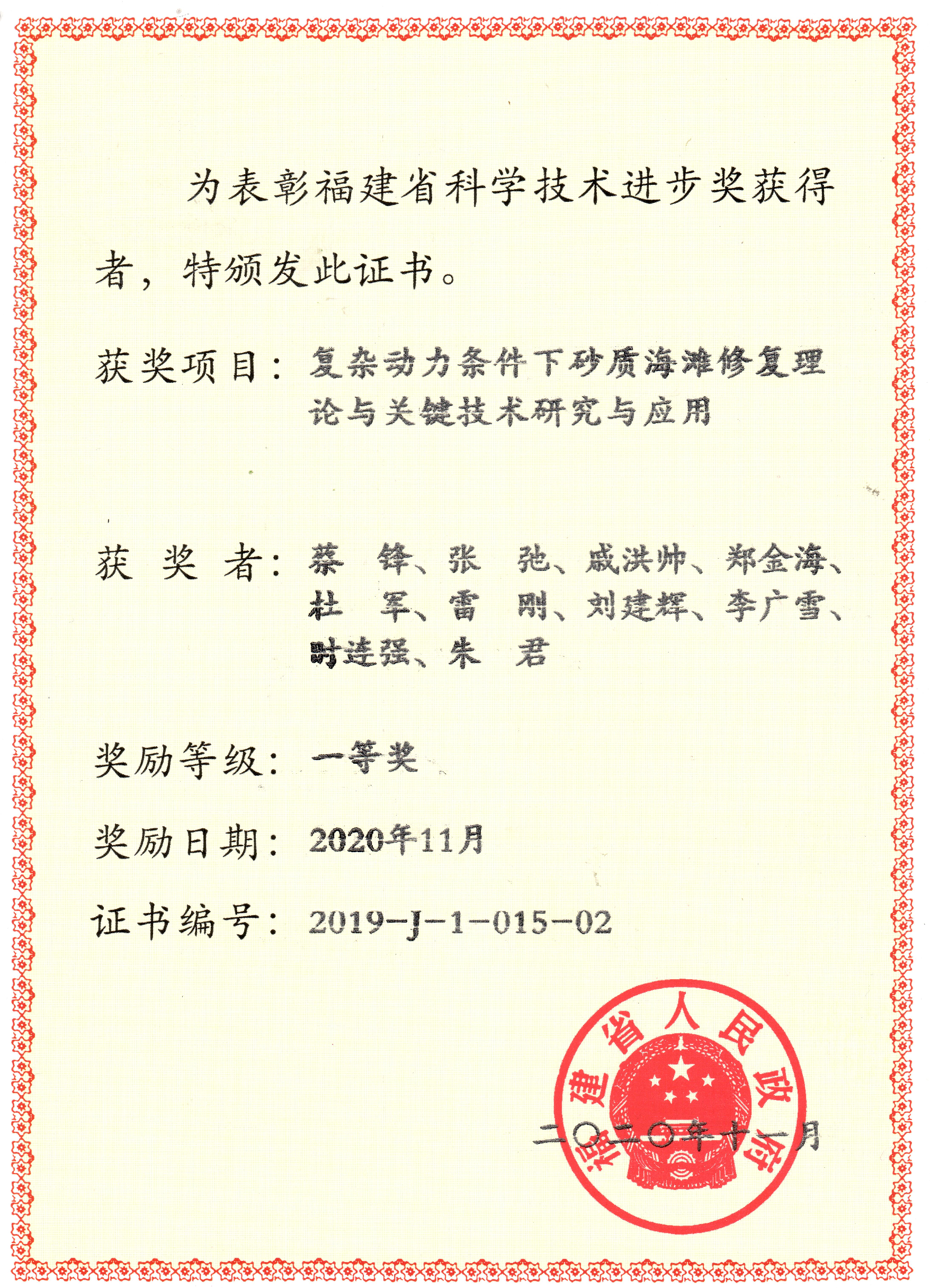 近期,福建省科学技术奖励大会在福州举行,颁发了2019年度福建省科学技术奖。由我实验室和自然资源部第三海洋研究所等单位合作完成的项目“复杂动力条件下砂质海滩修复理论与关键技术研究与应用”获得2019年度福建省科技进步奖一等奖。开云电竞网为第二完成单位,实验室主任郑金海教授为第四完成人。