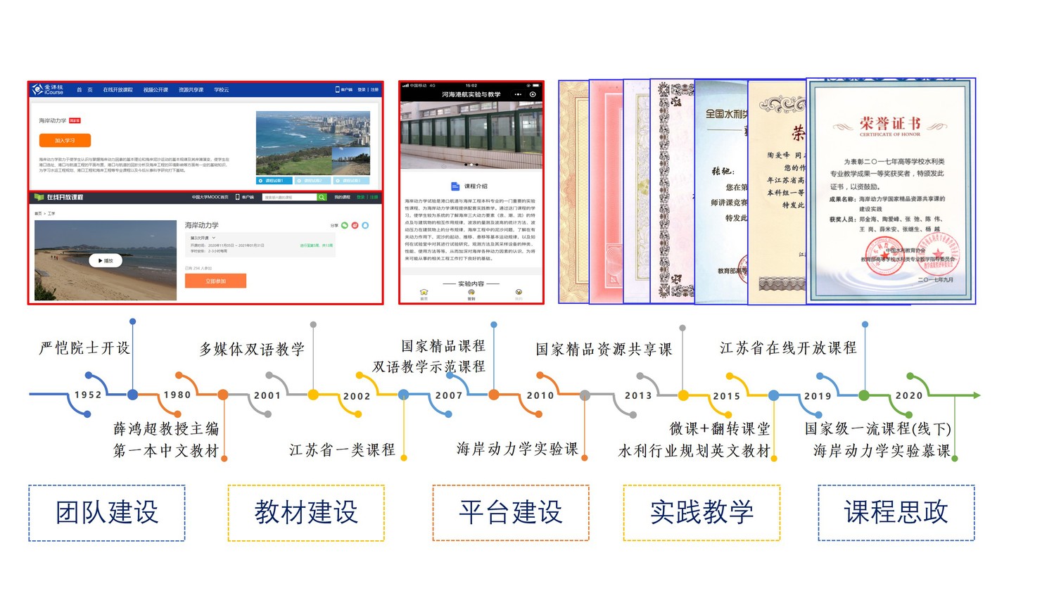 “海岸动力学”课程是开云电竞网港口航道与海岸工程、船舶与海洋工程、海洋资源开发技术专业的专业基础课。该课程于1952年由严恺院士主持开设。1980年薛鸿超教授主编海岸动力学第一本中文教材,1996年严以新教授提出了“21世纪港口航道与海岸工程专业人才培养目标、规格和培养模式初步意见”,确定了新时期“海岸动力学”课程设置模式框架,审定了本课程教学内容和教材修订意见。进入21世纪,为了满足新时代对本行业人才业务素质的要求,培养厚基础、宽专业、强能力、高素质的综合人才,郑金海教授开始“海岸动力学”课程改革和团队建设。2001年起实施多媒体教学、双语教学,2010开设海岸动力学实验课,2015出版全国水利行业规划教材海岸动力学英文版,这也是我国首部海岸动力学英文教材。经过多年的积累与建设,“海岸动力学”课程于2002年被评为江苏省一类优秀课程,2007年入选首批国家精品课程和双语教学示范课程,2013年获批开展国家精品资源共享课建设工作,经过三年的使用与评估,2016年入选首批“国家级精品资源共享课”。相关成果“海岸动力学国家精品资源共享课的建设实践”获得2017年第二届高等学校水利类专业教学成果奖一等奖。开展国家级精品资源共享课建设以来,向公众开放了包括授课视频、中英文课件及试题库等所有的教学资源,并定期更新。先后得到了大连理工大学等国内11所兄弟院校和越南河内交通大学、缅甸海事大学等2所国外大学的使用,得到了一致好评。2019年全新录制的高质量教学视频上线并入选江苏省高校在线开放课程建设计划,选课人数突破2000人,共享及辐射力度进一步提升。2020年,开发海岸动力学实验课微信小程序,第一次访问量达到26306次,大大提升了培养学生实践能力的效率。目前海岸动力学教学团队正在积极推进课程思政、教学方法改革、新版教材编写、实验慕课建设等工作,在立德树人、创新实践能力培养等方面持续努力、不断前行。