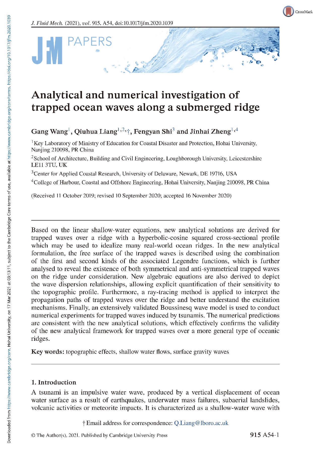 王岗副教授、郑金海教授和“河海学者”讲座教授Qiuhua Liang博士及Fengyan Shi博士合作完成的研究论文“Analytical and numerical investigation of trapped ocean waves along a submerged ridge”发表在流体力学领域享有盛誉的国际顶尖期刊《Journal of Fluid Mechanics》上(https://doi.org/10.1017/jfm.2020.1039)。研究工作得到国家自然科学基金(5207112851579090)的资助。