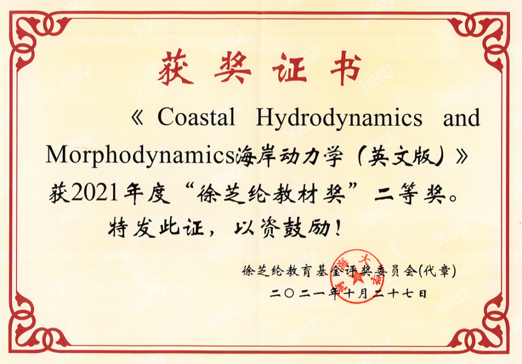 “徐芝纶教材奖”是徐芝纶教育基金设立的奖项,每2年评选一次,每次评选出1项一等奖和2项二等奖。《Coastal Hydrodynamics and Morphodynamics 海岸动力学(英文版)》内容涵盖海岸水动力泥沙运动和岸滩演变,是符合我国港口航道与海岸工程专业课程体系要求的海岸动力学英文版教材。出版六年来,不仅在开云电竞网港航专业本科生教学和“一带一路”本科留学生培养中发挥了重要作用,也被8家兄弟院校、2家国外大学以及1家涉外行业单位推广使用,为我国11部英文版水运工程标准规范的编译和海外工程企业服务“一带一路”基础设施互联互通提供了重要参考。