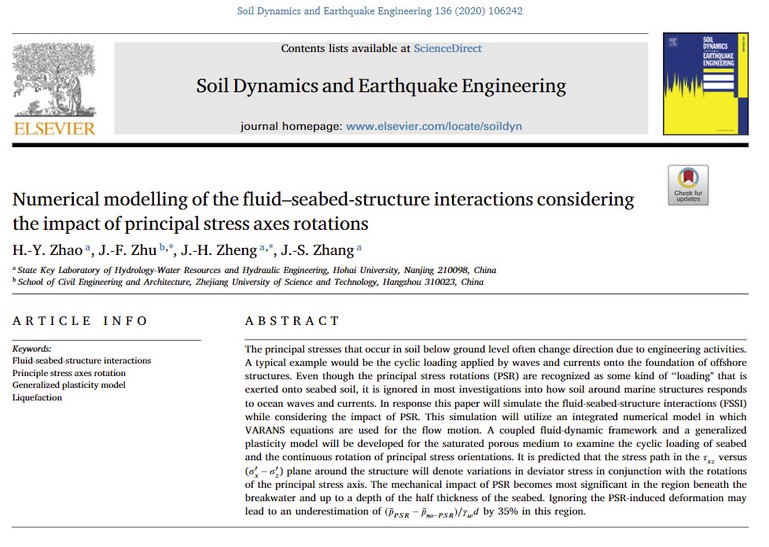 2021年12月16日,国际著名学术期刊《Soil Dynamics and Earthquake Engineering》(SDEE)公布2020年度最佳期刊论文奖(The SDEE Ahmet Cakmak 2020 Best Paper Award)。我实验室河口海岸综合治理与保护研究团队的“Numerical modelling of the fluid-seabed-structure interactions considering the impact of principal stress axes rotations”的论文获得殊荣。该奖项由SDEE期刊的三位主编及十二位副主编从该期刊上一年度论文中提名、遴选,并最终授予一篇具有突出贡献值得特别表彰的论文,这是该奖项设立以来首次授予中国研究人员。赵弘毅副研究员为论文第一作者,实验室主任郑金海教授为共同通讯作者,合作者包括张继生教授和浙江科技学院的朱剑锋教授。论文得到国家自然科学基金委及江苏省科技厅的资助,首次在国际上阐明了波流、海工结构物与海床地基非线性耦合作用过程中主应力轴循环旋转对海工结构物及其海床地基动力响应机制的影响机理,于2021年3-5月入选ESI热点论文(前1‰)。