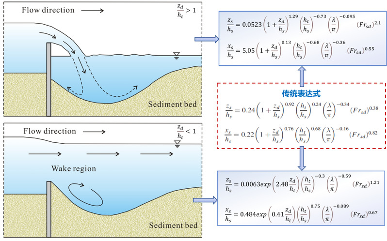 2022年1月,美国土木工程师协会公布了2022年度J. C. Stevens Award。我实验室河口海岸综合治理与保护研究团队骨干成员管大为教授与四川大学合作的讨论文章“Discussion of ‘New Approach to Predicting Local Scour Downstream of Grade-Control Structure,’ in the Journal of Hydraulic Engineering, June 2021.”获得殊荣。这个奖项为了纪念美国土木工程师协会杰出工程师、前主席John C. Stevens先生于1943年设立的,每年评选一次,由美国土木工程师协会环境与水资源分会主办的Journal of Hydraulic Engineering、Journal of Hydrologic Engineering、Journal of Environmental Engineering等7种期刊的全体编委从前一年度发表的讨论论文中提名、遴选,授予一篇最具突出学术贡献的文章。这是该奖设立近80年来第一次授予河流与海岸动力学领域的中国学者,先前获奖的研究人员包括国际著名泥沙研究学者Hans Albert Einstein、IAHR前主席John F. Kennedy、美国科学院院士Gary Parker等。已有研究表明,固床工的水毁率高达70%,损毁还会使上下游地形发生剧烈冲刷下切,产生严重后果。由于固床工的冲刷破坏通常发生在强动力、强输沙的洪水过程中,冲刷机理非常复杂,冲刷深度预测十分困难。论文提出在固床工冲刷分析模型中考虑水流淹没度的影响,基于“自由出流”和“淹没出流”条件下的冲刷特征,重构了固床工冲刷的理论模型,建立适用于不同淹没条件的冲刷深度预测新方法(图3)。新的理论模型更能准确反映复杂水动力条件下固床工的冲刷机制,提出的冲刷深度预测方法与传统方法相比,平均误差减少58%。