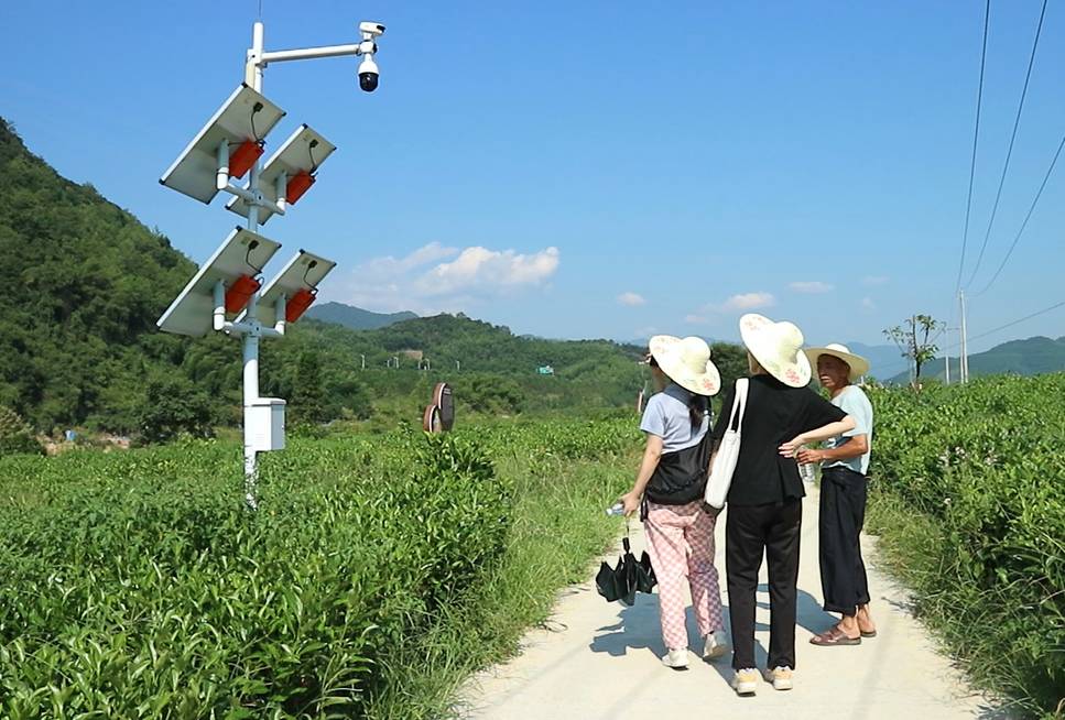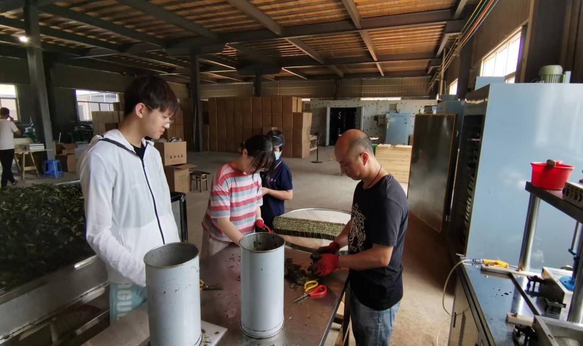 7月11日上午,调研团紧接着前往位于政和县富美村的莲花山生态茶园进行考察学习。调研团跟随着茶农沿着茶山、深入茶园实地观察了解虫害声光防治系统设备,在茶农的解说下对于此种效率高、运行成本低的新型虫害绿色防治技术有了更深的认识,其能够有效降低农药残留,大幅提高农产品质量和产量的显著优势也使调研团成员对于该项技术更具兴趣,带动队员与茶农进行进一步的请教交流。在当地茶农热情接待下,成员们分别品尝了当地严格把控生态种植的所制出的政大、福大及小野等不同茶种,了解了富美村“头带帽、腰缠线、脚穿鞋”的因地制宜生态调控政策,并进入茶厂亲身感受体验制茶的工艺流程,对当地的茶业生态发展现状有了更深的了解。