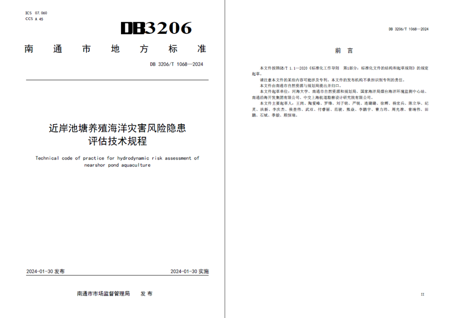 近日,我实验室团队主编的地方标准《近岸池塘养殖海洋灾害风险隐患评估技术规程》(DB3206/T 1068-2024)《滩涂贝类养殖海洋灾害风险隐患评估技术规程》(DB3206/T 1067-2024)正式发布(南通市地方标准发布公告2024年第1号(总第25号)),于2024年1月30日起实施。该标准由南通市自然资源和规划局归口管理。参与标准编制的团队成员有王岗、陶爱峰、罗锋、付睿丽、范俊、熊炎等。