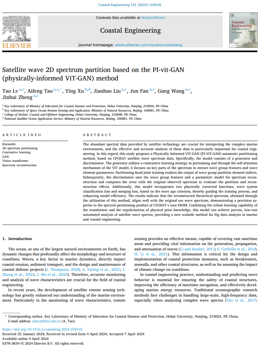 近日,国际海洋工程知名期刊Coastal Engineering在线发表了来自海岸灾害及防护教育部重点实验室的最新研究成果“Physically-Informed ViT-GAN for 2D Spectrum Partitioning of Satellite Wave Data”(基于融合物理先验知识的ViT-GAN方法的卫星海浪二维谱分割方法),该成果的第一作者为博士研究生吕韬,通讯作者为陶爱峰教授。