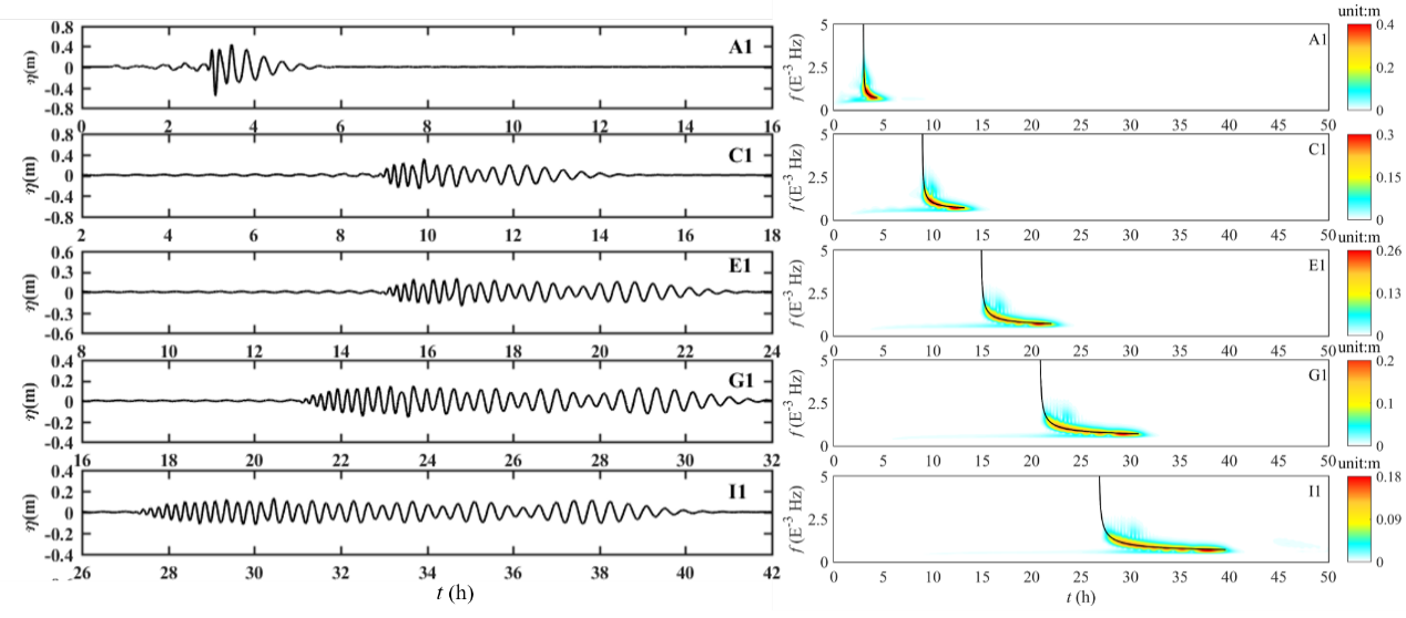 基于线性长波理论推导出了双曲余弦平方型大洋海脊上的俘获波解析理论,从波浪在海脊上的传播路径上阐明了海脊俘获波由于波浪折射效应而存在的产生机理。理论分析表明,大洋海脊上分别存在着奇偶模式的海脊俘获波,其波面过程可以表示为连带勒让德函数的形式。奇模式海脊俘获波的波面在脊顶始终为零,沿海脊两侧以反对称的形式运动;偶模式海脊俘获波的波幅在脊顶最大,波面在海脊两侧对称运动(图 2)。俘获波对应的频散关系可以表示为代数多项式的形式,由其可显式表达出相应的相位速度和能量速度。海脊俘获波的相位速度随着周期的增加而增加,但其能量速度却随着周期的增加而减小。通过数值计算模拟海啸在大洋海脊上的传播过程,结果表明大部分海啸波都被限制在海脊地形上以俘获波的形式传播,波幅沿海脊截面的分布与理论完全吻合(图 3);由海脊不同位置处的波面过程对应的小波谱证实了理论分析发现的短周期俘获波能量传播较快而率先抵达的现象(图 4)。