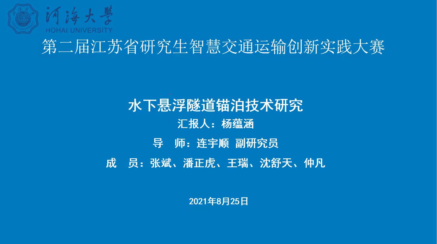 2021年8月,第二届江苏省研究生智慧交通运输创新实践大赛在扬州大学成功举行,本届大赛共有12所高校研究院组队报名。在校研究生院的精心组织和指导下,我校学子克服疫情带来的不利影响,通力合作、全力以赴,从30余支决赛队伍中脱颖而出,我实验室张斌、潘正虎、杨蕴涵、王瑞、沈舒天同学共同完成的《水下悬浮隧道锚泊技术研究》(指导老师:连宇顺老师)获得交通基础设施类优秀奖。