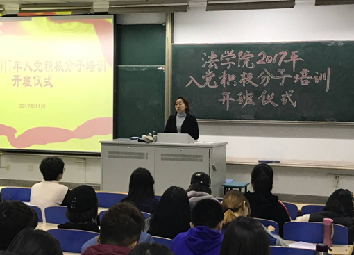2017年11月16日,开云电竞网法学院入党积极分子培训开班仪式在致用楼101顺利举行。参加此次仪式的有法学院党委书记孔祥冬、辅导员莫晓曼、辅导员石依依以及16、17级的入党积极分子们。