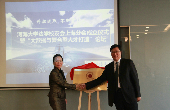 为了此次成立仪式,中伦律师事务所合伙人、经济法1991级周月萍率领团队,与一批热心校友进行了长时间的筹备。60多名上海及邻近的校友前来参加活动,其中既有河海法学首批即经济法1988级学长,也有今年刚刚毕业到上海各高校继续深造的法学和法学双学位2013级本科生。为了响应党的十九大报告提出的“推动互联网、大数据、人工智能和实体经济深度融合”的号召,上海分会成立仪式与“大数据与复合型人才打造”论坛有机融合,特邀浙江省高级人民法院执行庭庭长、浙江大学法学博士候选人叶向阳先生以“互联网时代的司法变革——浙江法院道交纠纷‘网上数据一体化处理’综合改革实践”为题进行演讲,特邀上海教育电视台常务副台长陆生女士以“当AI来敲门——智能机器人未来将会取代哪些岗位”为题进行演讲,并特邀河海校友、上海协君投资咨询有限公司董事总经理印朝富先生以“复合视野助力职业转型”为题与校友分享从河海毕业后21年的执业体会。