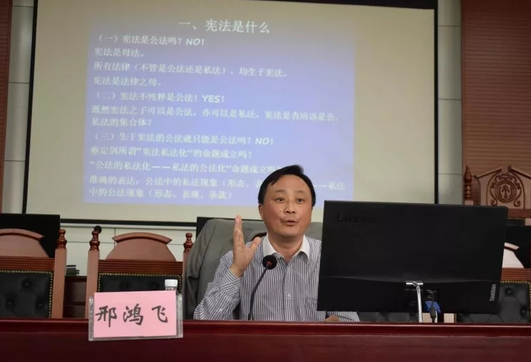 邢鸿飞教授首先提出了“宪法是什么”的问题,讨论了宪法的归属。他还进一步阐释了“公法中有私法现象、私法中的公法现象”的论题,举了作为公法的环境保护法的运用也可能涉及民事赔偿、婚姻法的演化等例子。 紧接着,邢教授开始了第二部分“宪法有什么”的讲解。其中涉及到国体、国家形式、公民的基本权利义务。他结合中美贸易战等社会热点问题对国家意识形态进行了专业解读。 而在“宪法干什么”的板块,邢教授阐明了宪法作为公民权利保障书的作用,和宪法作为最高法的实际意义。最后,邢教授按照时间顺序讲述了我国宪法的历次修正及其内容,让大家了解到修宪对于社会经济发展的重要意义。他还特别强调了2018年修宪的内容、背景、目的,也提醒大家目前的制度发展中仍有待解决的许多问题。