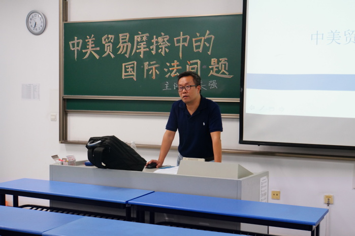 朱强老师首先对中美贸易战作了概述,并依次向同学们简述了中美之间的“232之战”、“301之战”以及“301+之战”。在正式介绍这三次贸易战具体的情况前,朱强老师指出同学们普遍对国际法的“效力不足”、“没有实效”的误解,并指出国际法在调解、解决国际争端中重要的地位。接下来,朱强老师向我们介绍了在此次贸易战争诉中中美各自所采用的的国际法理依据以及相关的国内法依据。首先讲了美国所依据的其《贸易法》第232条、第301条B项,向大家细致分析了此次贸易战的焦点即“301条款”是否属于WTO的管理事项,并指出美国的《贸易法》232条以保护国家安全为幌子实为保障措施的行为。之后朱老师又为大家讲述了中国相关的反制措施以及相关的法理依据,即“不得随意提高关税”(GATT第二条)、“不得采取歧视性措施”(GATT第一条)并指出了我国在这些反制措施中所存在的问题。最后朱强老师介绍了国际法在中美贸易中行为的约束力和边界线以及争议时援引的依据的作用。