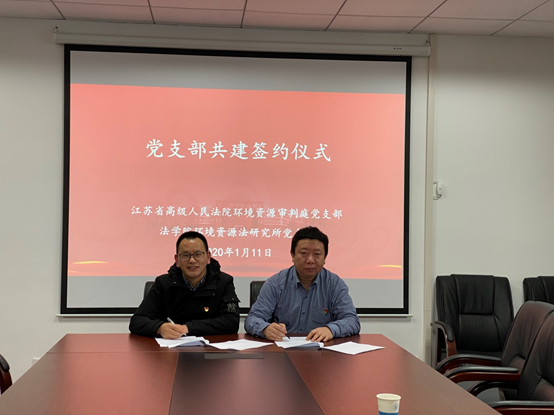 1月11日下午,法学院环境资源法研究所党支部与江苏省高级人民法院环境资源审判庭党支部在行政楼823举行党支部共建签约仪式。江苏省高级人民法院环境资源审判庭党支部书记刘建功、组织委员臧静、宣传委员陈迎,学院党委书记孔祥冬,环境资源法研究所党支部书记徐安住、副书记吴隽雅,学院党委委员莫晓曼、组织员陈文琪参加此次活动。