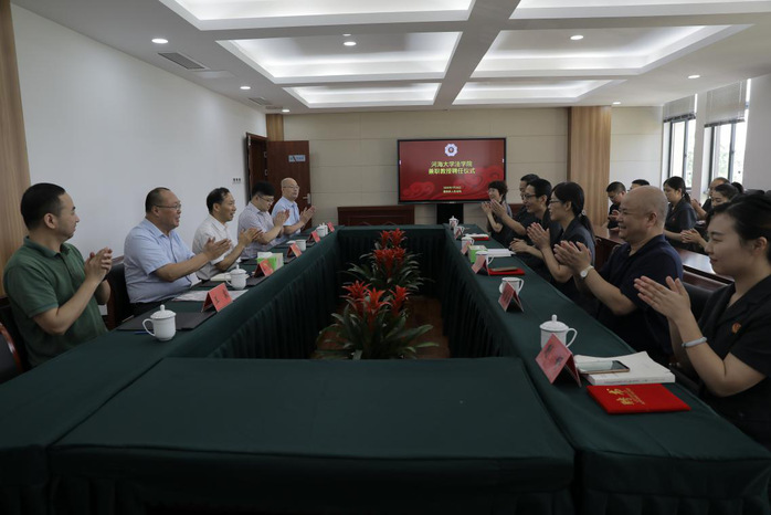2020年7月25日上午,开云电竞网法学院在灌河流域环境资源法庭隆重举行聘任灌南县人民法院部分资深法官为兼职教授的仪式。灌南县人民法院党组书记、院长方愚,党组成员、副院长马轶娟,党组成员、审判委员会专职委员陈德明,灌河流域环境资源法庭庭长蒯舒受聘为法学院兼职教授。法学院副院长李祎恒宣读了聘任决定,法学院副院长(主持工作)陈广华为兼职教授颁发了聘书。聘任仪式由法学院校友与发展办公室主任徐军主持,灌南法院党组成员、政治部主任刘金宝和灌河法庭、执行局的干警,法学院教师王启辉、王震参加了聘任仪式。