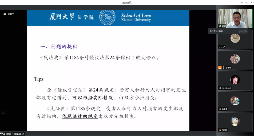 5月13日晚,法学院邀请了厦门大学法学院副院长、教授、博士生导师郑晓剑教授通过线上会议的形式为师生们作了以“我国民法典中公平分担损失规则之完善”为主题的精彩讲座。讲座由法学院党委副书记、副院长李祎恒主持,学院100多名师生参加了讲座。
