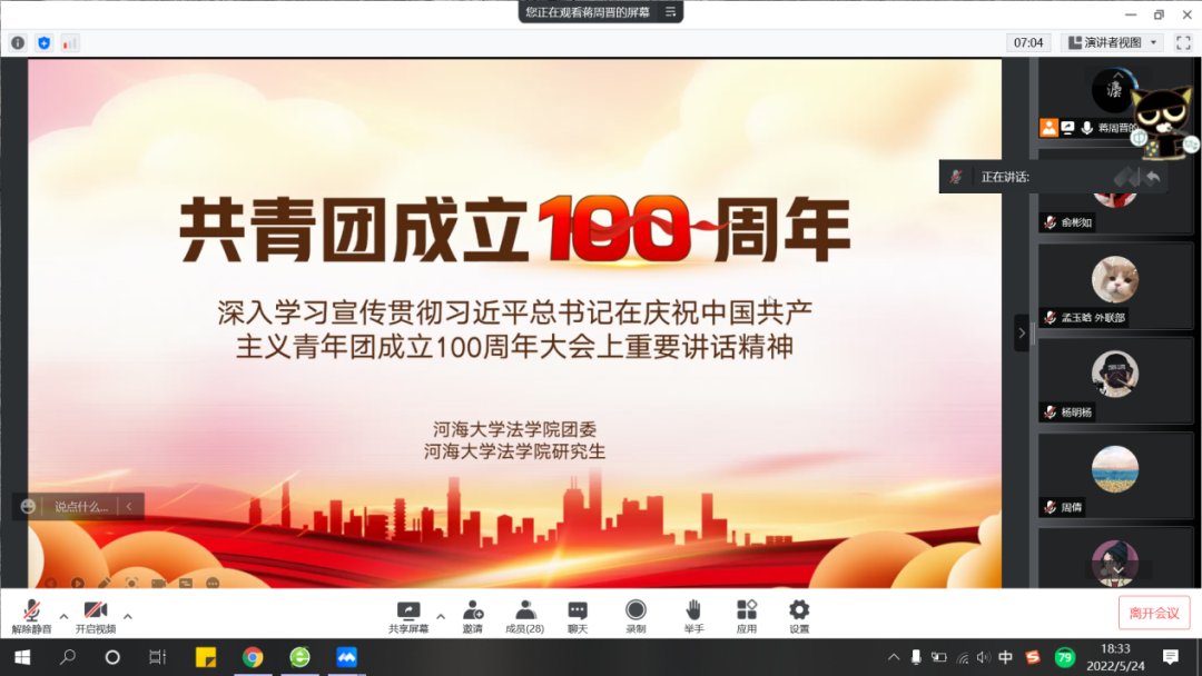 庆祝中国共产主义青年团成立100周年大会于2022年5月10日在京隆重举行。习近平总书记出席大会并发表重要讲话,回顾了共青团百年奋斗的青春历程,阐明了共青团工作的历史经验,提出了新时代做好共青团工作的殷切希望。5月24日晚,法学院研究生会全体工作人员及各班主要班委于线上开展“深入学习宣传贯彻习近平总书记在庆祝中国共产主义青年团成立100周年大会上重要讲话精神”专题学习教育活动。研究生会主席蒋周晋向大家介绍习近平总书记在会上发表的重要讲话内容。