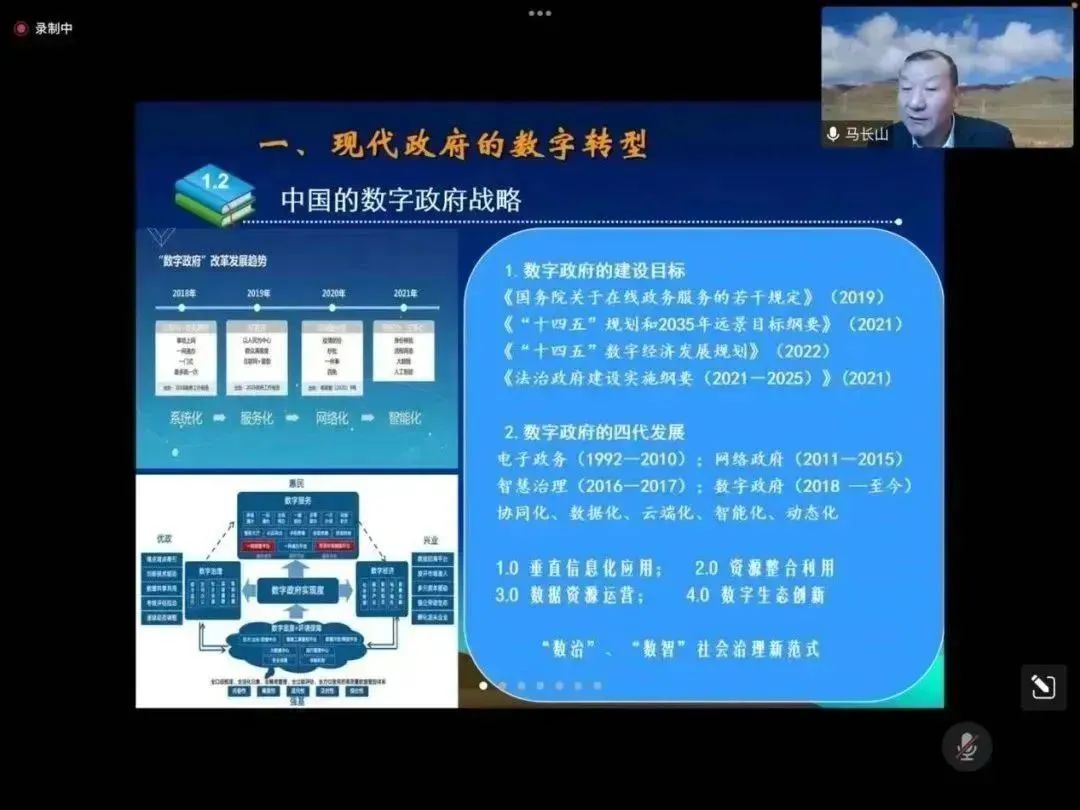 在数字政府的发展特点方面,马长山教授为了更好地让师生们理解政府从传统模式到数字化模式的转型,从政府角色的历史演变、中国的数字政府战略以及数字政府的运营模式三方面详细介绍了数字时代的政府方案,并总结出数字政府运行中平台化、数据化、在线化以及智能化的四大特点,为师生更加深入地理解数字政府的发展逻辑做了铺垫。