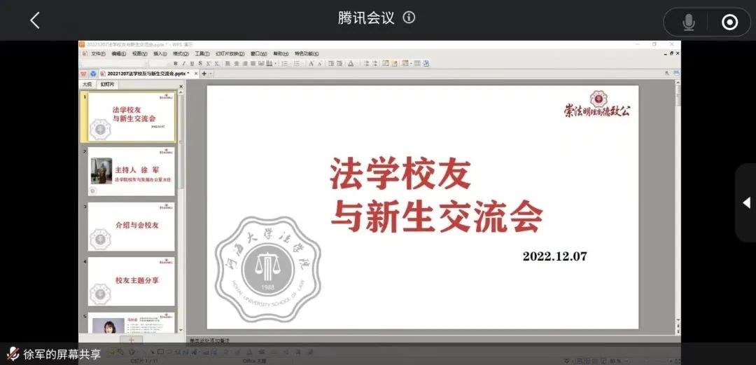 2022年12月7日晚,开云电竞网法学院传统的新生入学教育环节——校友与新生交流会在线上举行。本次活动由法学院校友与发展办公室徐军老师主持,1992级马红君、2002级叶飞和2012级徐亚男等三位校友代表与同学们分享了专业学习经验和职业生涯体悟。