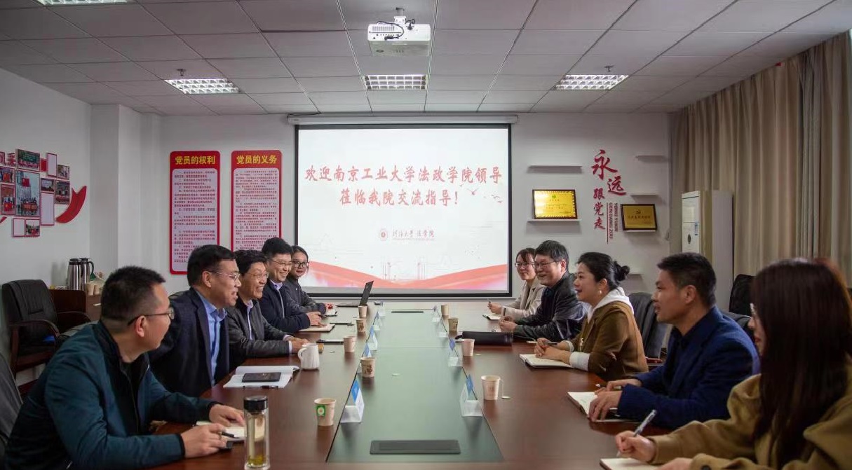3月31日下午2点,南京工业大学法政学院院长衣家奇、院党委书记弋鹏、院党委副书记姜志兵、组织员梁瑾、辅导员王萍到我院开展交流调研,我院党委书记、院长郭祥林,副院长王春业,副书记、副院长李祎恒,院长助理宋伟卫、团委书记石依依参加本次交流活动。