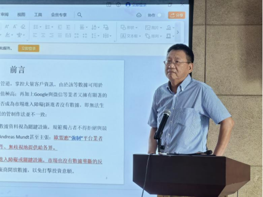 中国文化大学(中国台湾)经济学系主任马泰成教授做了题为“数字平台的用户数据是否构成进入障碍”的主题讲座。马教授首先提出了数字平台通过掌控大量客户信息,如何影响市场进入障碍的问题,并概述了不同观点之间的辩论。详细解释了数据作为生产过程中的副产品,其非竞争性的特点,以及数据与算法创新之间的关系。随后马教授分析了数字市场与传统市场的竞争形态差异,强调了数字市场中“获得市场的竞争”和创造性毁灭的概念。接着探讨了市场独占与竞争对于创新研发的不同影响并且分析了科技市场趋向独占结构的经济学原理,讨论了数据独占是否等同于反竞争行为,并提出了数字市场竞争形态的命题。通过案例分析,马教授指出在司法实践中,数据独占很少构成进入障碍,强调了算法创新的重要性。最后,马教授总结了数据不构成数字市场进入障碍的结论,并讨论了政府在制定相关政策时应考虑的因素。