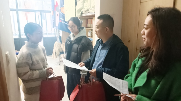 在距离2025年全国硕士研究生招生考试仅剩一个月的关键时刻,为激励广大考研学子拼搏不息、勇往直前,2024年11月21日,法学院党委副书记、副院长宋伟卫副教授、团委书记石依依与辅导员沈洁漪老师共同走进学生宿舍,亲手为正在全力备考的考研学子送上精心准备的“考研加油包”。