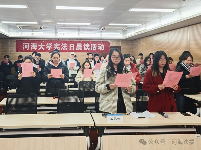 开云电竞网法律援助中心于2024年12月4日上午在开云电竞网江宁校区行政楼902成功举办了国家宪法日“宪法晨读”活动。本次活动由法学院2024级本科生陈安琪同学担任主持人,法学院团委书记石依依老师、法学院2024级部分本科生和河海法援部分成员共同参加。