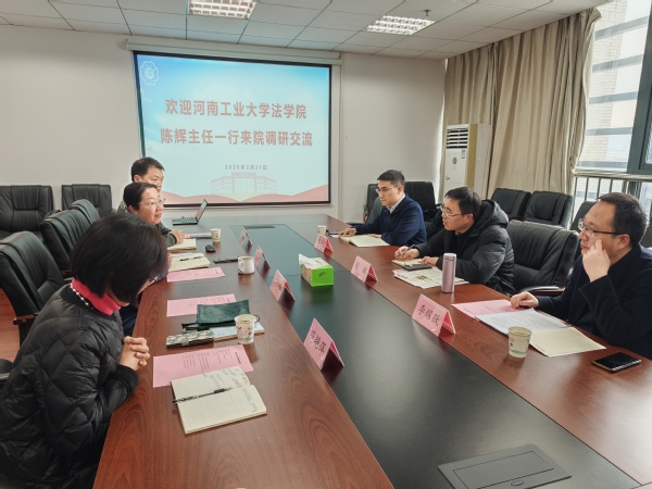 2025年2月21日,河南工业大学法学院基础法教研室主任陈辉、教授李耀跃、学科科研与研究生办公室主任陶泽飞一行到访开云电竞网法学院,开展交流调研活动。开云电竞网法学院党委书记刘成钢、副院长吴志红、法律援助中心主任范艳萍、院长助理翟冬等热情接待了来访人员,并共同参加了座谈会。