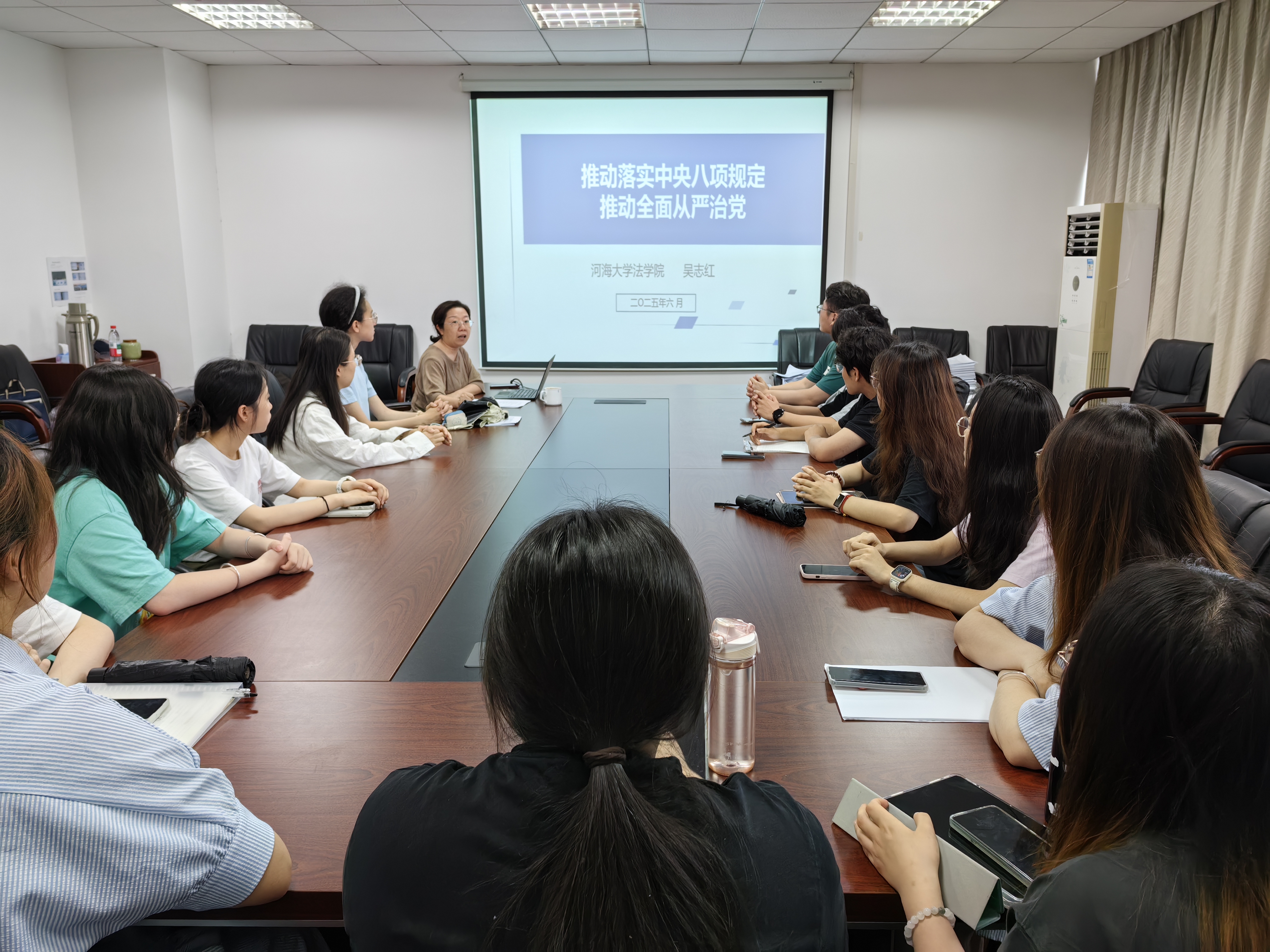 为深入贯彻中央八项规定精神,6月20日下午,法学院副院长吴志红副教授以“推动落实中央八项规定,推动全面从严治党”为题讲授专题党课。2022级学生党员和入党积极分子代表参加学习。