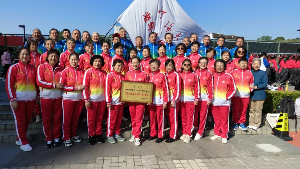 他们迈着整齐的步伐,精神抖擞,挥舞着旗帜, “百十河海,风华正茂;银龄健儿,再展英豪!”的口号震彻全场。他们虽已华发苍颜,但眼神中闪烁着与年轻学子无二的激情与豪迈。当他们通过主席台时,看台上爆发出阵阵热烈的掌声。老体协方队获最佳入场方队的荣誉奖牌。
